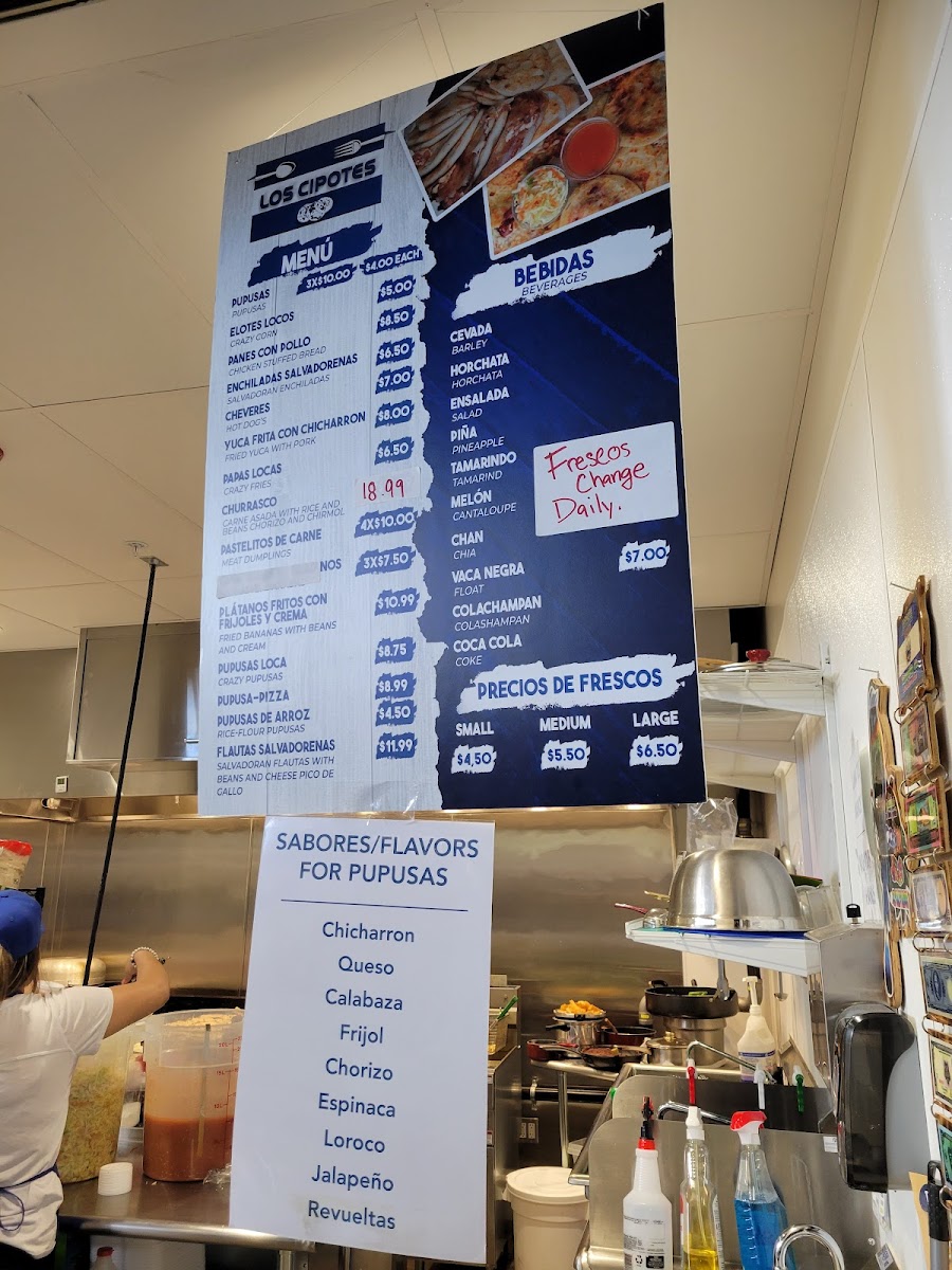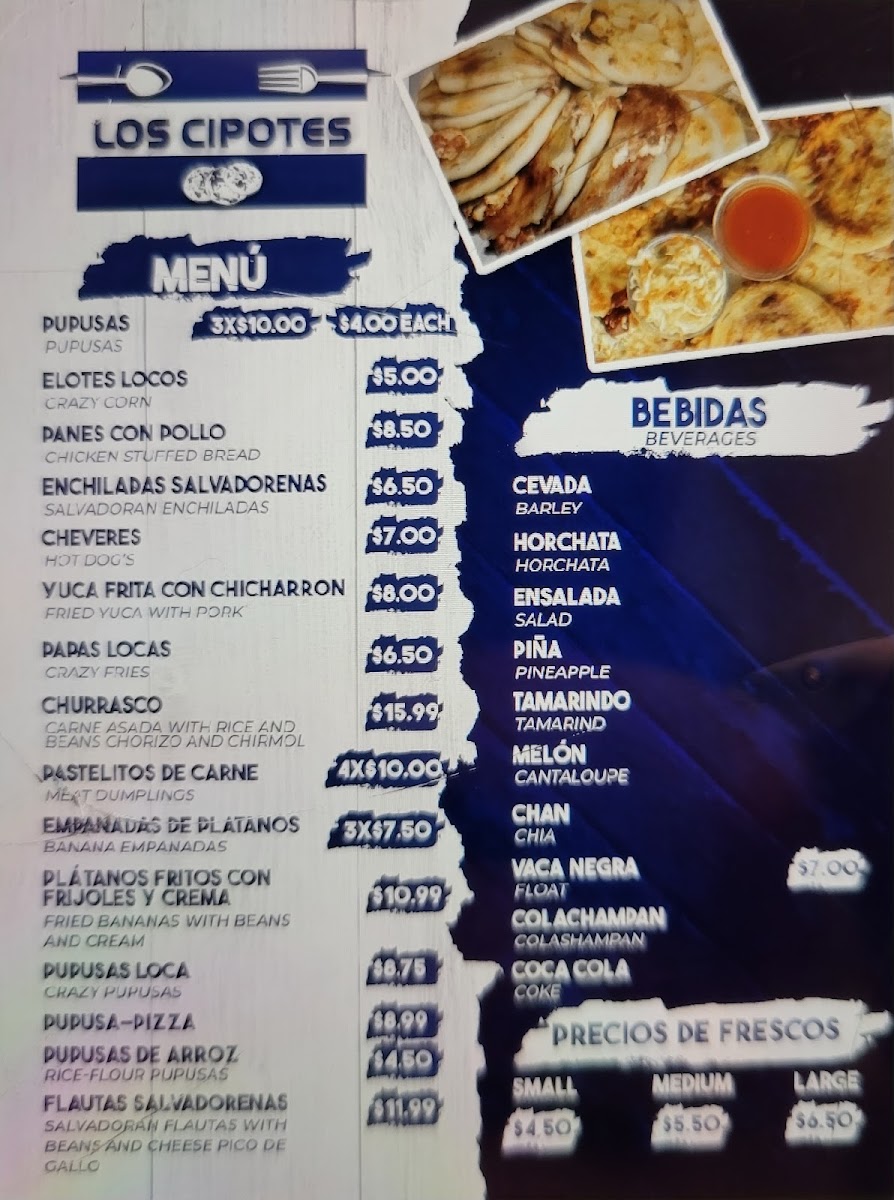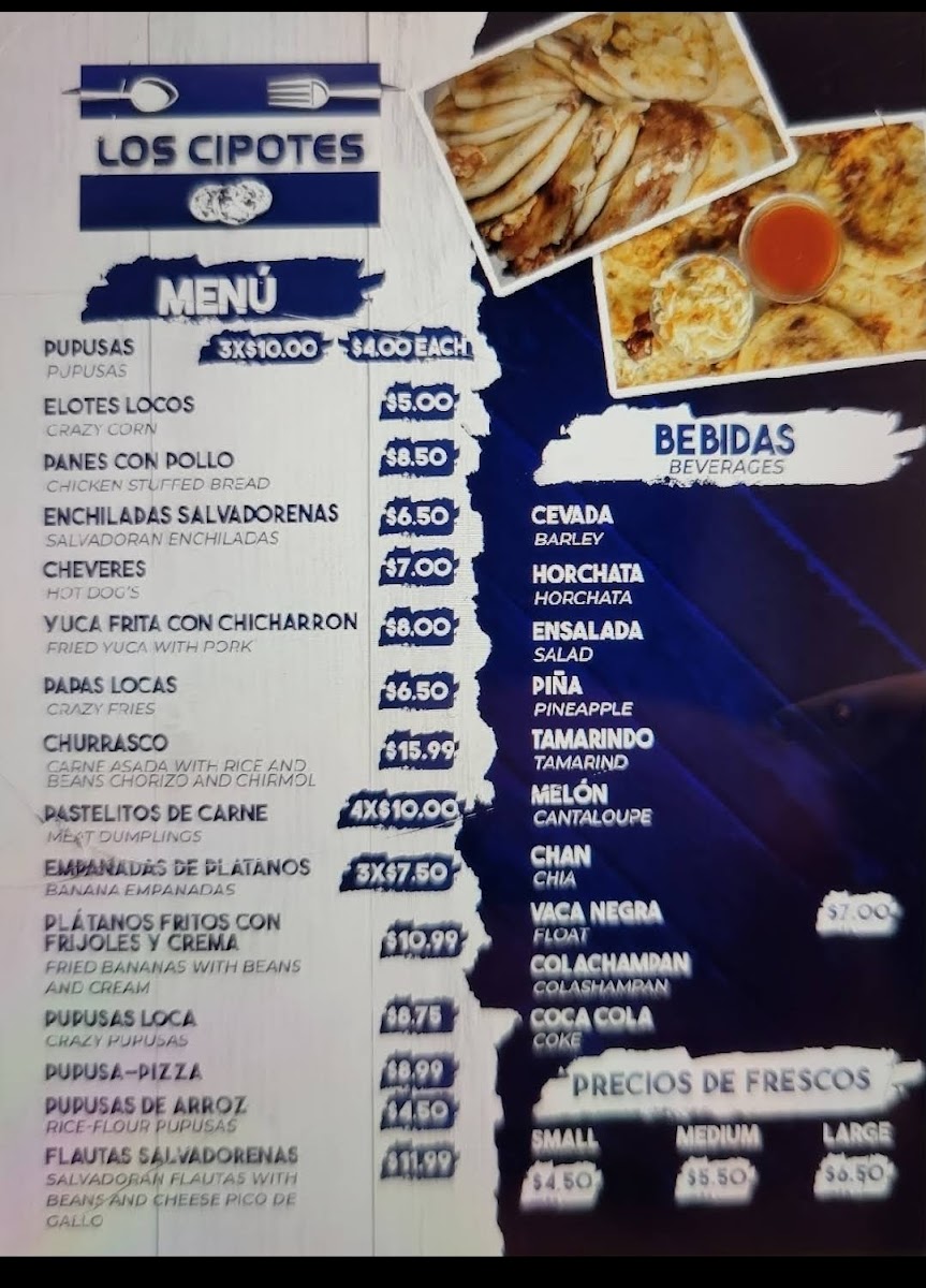 From a diner’s point of view, the menu at Los Cipotes delivers a simple yet appealing spread anchored by their savory pupusas and refreshing drinks. For the pupusas, you can choose from Chicharron, Queso, CalabazaFrijol, or Chorizo, each promising a different blend of flavor and texture. On the beverage side, the selection includes traditional and fruity refreshments like Cevada, Horchata, EnsaladaPineapple, Tamarindo, and Melón. This straightforward lineup suggests a focus on quality and tradition - you know exactly what you’re getting. The combination of warm, comforting pupusas with cool, thirst-quenching drinks makes for a satisfying and balanced meal, ideal whether you’re craving something hearty or something light.